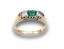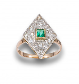 SORTIJA, ESTILO ART DECO, EN ORO Y PLATINO CON ESMERALDA Y DIAMANTES