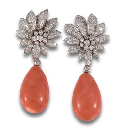 PENDIENTES LARGOS DE FLORES DE DIAMANTES Y PERILLA DE CORAL, EN ORO BLANCO, DESMONTABLES