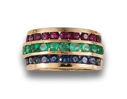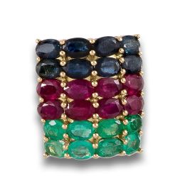 ANCHA SORTIJA EN ORO AMARILLO CON ESMERALDAS, RUBÍES Y ZAFIROS