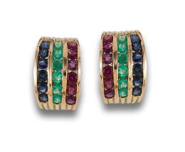 PENDIENTES MEDIAS CRIOLLAS EN ORO CON ZAFIROS, ESMERALDAS Y RUBÍES