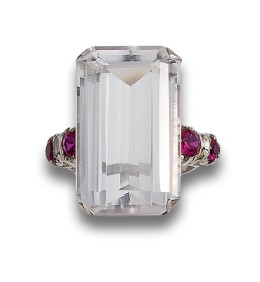 SORTIJA ESTILO ART DÉCO EN PLATINO, CON CUARZO HIALINO Y ROSAS DE FRANCIA