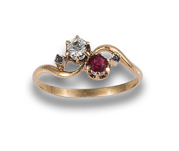 SORTIJA TÚ Y YO DE DIAMANTE Y RUBÍ SINTÉTICO, EN ORO AMARILLO