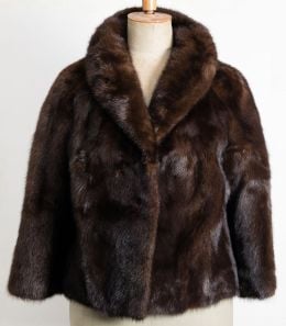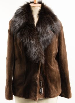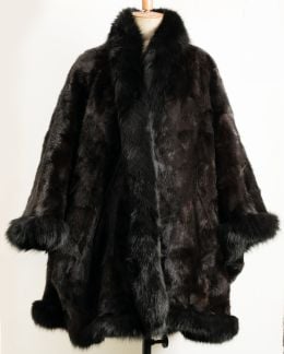 Capa de trozos de visón marrón y cuello y puños de piel de zorro