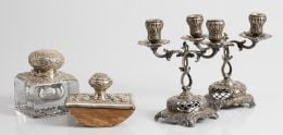 Secante y tintero de plata ley 916, cristal y madera, S. XX