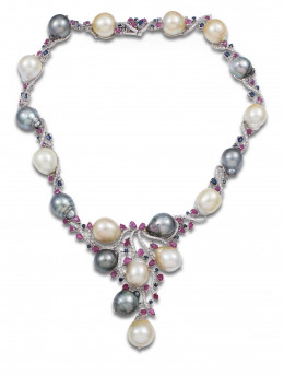 COLLAR CASCADA DE PERLAS AUSTRALIANAS, TAHITÍ, RUBÍES, ZAFIROS, DIAMANTES Y ORO BLANCO