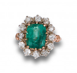 SORTIJA ROSETÓN, ESTILO ANTIGUO, DE ESMERALDA DE 4.40 CT., DIAMANTES Y ORO AMARILLO