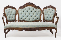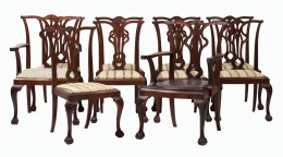 Sillería compuesta por 2 butacas y 8 sillas estilo Chippendale, med. S. XX, con distintas tapicerías. .