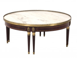 Mesa de café estilo Luis XVI con tapa de mármol blanco y galeria de latón dorado y calado..