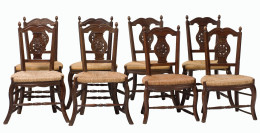 Ocho sillas de roble tallado y calado con asiento de enea, Mallorca, ffs. S. XIX- S. XX