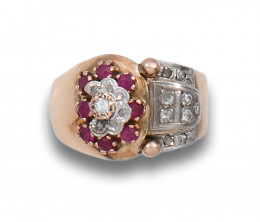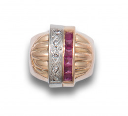 SORTIJA CHEVALIER, AÑOS 40, DE ORO AMARILLO, DIAMANTES Y RUBÍES