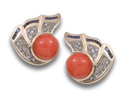 PENDIENTES CABUJONES DE CORAL, DIAMANTES, ZAFIROS SINTÉTICOS, EN ORO