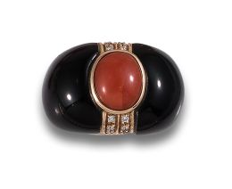 SORTIJA BOMBÉ DE CORAL, ÓNIX Y DIAMANTES, EN ORO AMARILLO