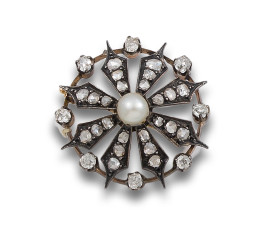 BROCHE, FF. S. XIX, EN ORO Y VISTAS EN PLATA CON DIAMANTES Y PERLA POSIBLEMENTE NATURAL