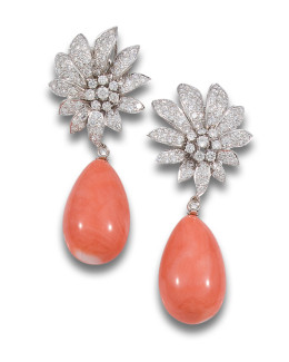 PENDIENTES LARGOS DE DIAMANTES Y CORAL, EN ORO BLANCO, DESMONTABLES