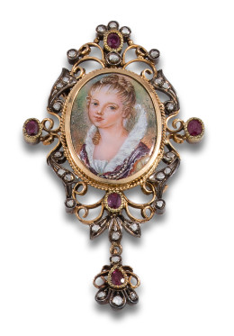 COLGANTE ADAPTABLE A BROCHE CON ESMALTES EN ORO Y PLATA CON DIAMANTES Y RUBÍES