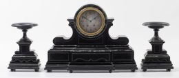 Guarnición de chimenea compuesto por reloj y pareja de copas, estilo Napoleón III, S. XX