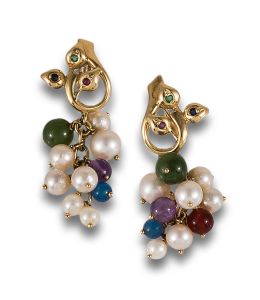 PENDIENTES RACIMOS DE PERLAS Y CALCEDONIAS TEÑIDAS, EN ORO AMARILLO