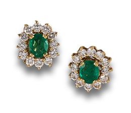 PENDIENTES ROSETONES DE DIAMANTES Y ESMERALDAS, EN ORO AMARILLO