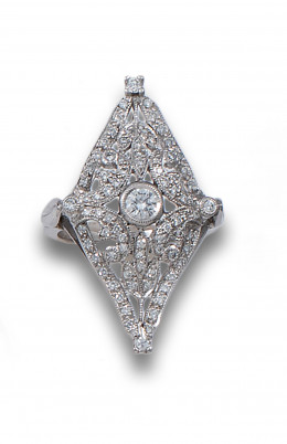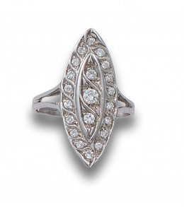 SORTIJA LANZADERA, ESTILO ANTIGUO, DE DIAMANTES Y ORO BLANCO