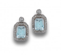 PENDIENTES COLGANTES DE DIAMANTES Y AGUAMARINAS, EN PLATINO