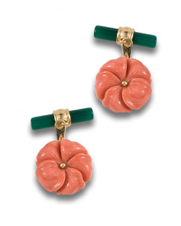 GEMELOS FLORES DE CORAL, CRISOPRASA Y ORO AMARILLO