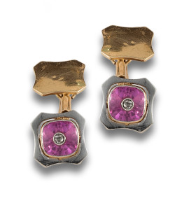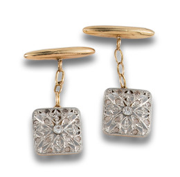 GEMELOS , AÑOS 40, BREVETE, EN ORO AMARILLO, DIAMANTES Y ROSAS DE FRANCIA