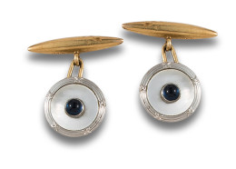 GEMELOS ANTIGUOS DE NÁCAR Y ZAFIROS SINTÉTICOS, EN ORO AMARILLO