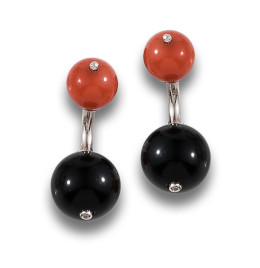 GEMELOS DOBLES DE CORAL Y ÓNIX Y DETALLE DE DIAMANTE, EN ORO BLANCO