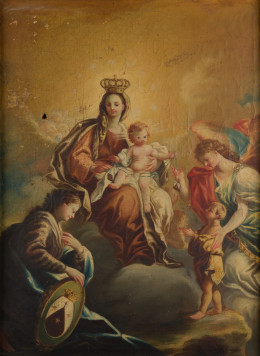 "La Virgen del Carmen, venerada por ángeles, entrega el escapulario a un niño"