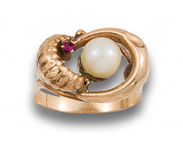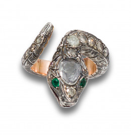 SORTIJA EN FORMA DE SERPIENTE DE DIAMANTES, ESMERALDAS, ORO Y PLATA