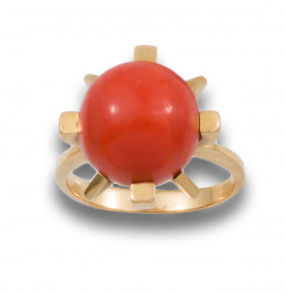SORTIJA, AÑOS 70, DE CORAL Y ORO AMARILLO