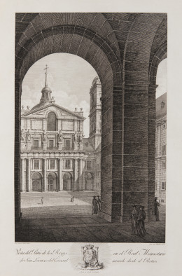 "Vista del Patio de los Reyes de San Lorenzo del Escorial en el Real Monasterio mirado desde el Portico" y " Vista del Monumento de Semana Santa del Real Monasterio de San Lorenzo"