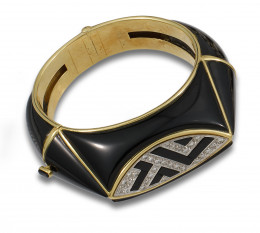 BRAZALETE FIRMADO GREGORY, AÑOS 70, DE ORO AMARILLO, DIAMANTES Y ÓNIX