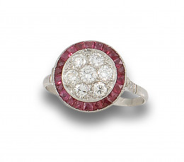SORTIJA OJO DE PERDIZ EN PLATINO CON DIAMANTES Y RUBÍES