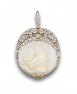 MEDALLA ART DECÓ DE SAN ANTONIO EN PLATINO, MADREPERLA Y DIAMANTES