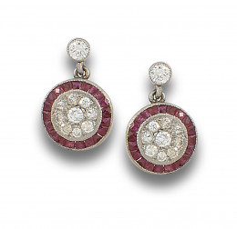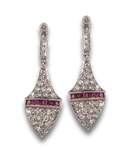 PENDIENTES, ESTILO ART DÉCO, DE DIAMANTES Y Y RUBÍES SINTÉTICOS, EN PLATINO