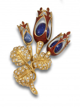 BROCHE EN ORO CON DIAMANTES, ESMALTES Y ZAIFROS
