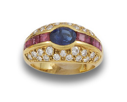 SORTIJA EN ORO CON ZAFIRO, RUBÍES Y DIAMANTES