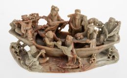 "Personajes en una barca", grupo en piedra de jabón, China, S. XX