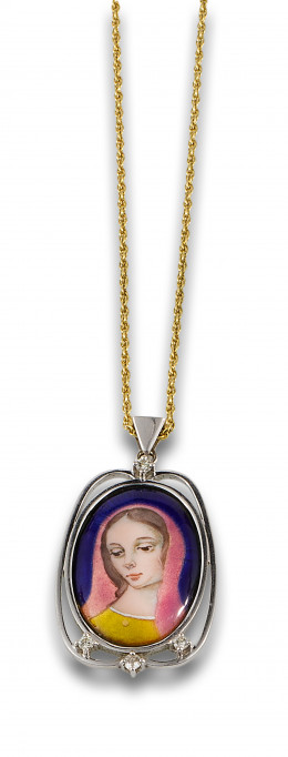 MEDALLA DE LA VIRGEN, AÑOS 70, DE ESMALTE, DIAMANTES Y ORO BICOLOR, CON CADENITA