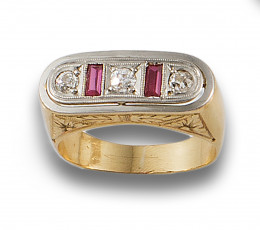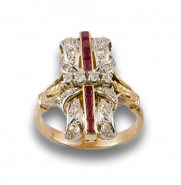 SORTIJA LANZADERA, ESTILO ANTIGUO, DE DIAMANTES, RUBÍES SINTÉTICOS Y ORO BICOLOR