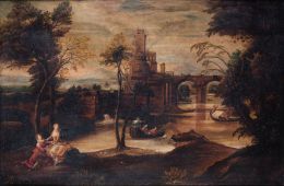 "Paisaje fluvial con arquitecturas y pareja galante"