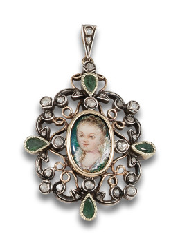 COLGANTE ESTILO ANTIGUO EN ORO Y PLATA CON DIAMANTES, ESMERALDAS Y ESMALTES