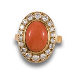 SORTIJA ROSETÓN DE CORAL Y DIAMANTES, EN ORO AMARILLO