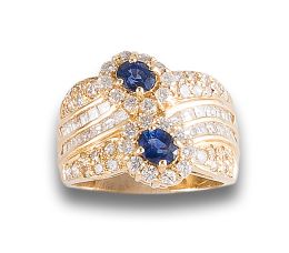 SORTIJA ANCHA DOBLE ROSETA DE DIAMANTES Y ZAFIROS, EN ORO AMARILLO