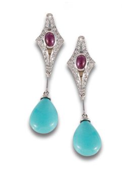 PENDIENTES EN ORO BLANCO CON DIAMANTES, RUBÍES Y TURQUESAS