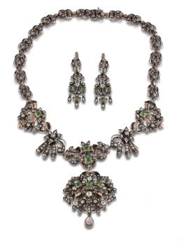 MEDIO ADEREZO FORMADO POR PENDIENTES Y GARGANTILLA DE LOS SS. XIX-XX EN ORO Y PLATA CON DIAMANTES Y VIDRIOS VERDES