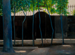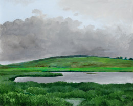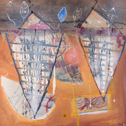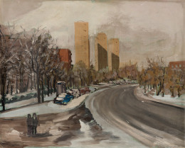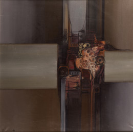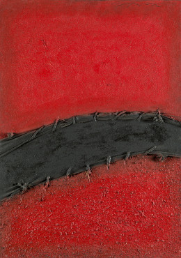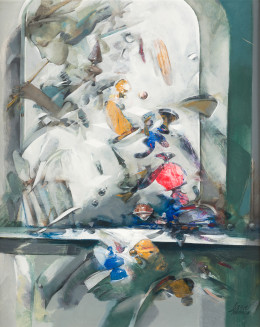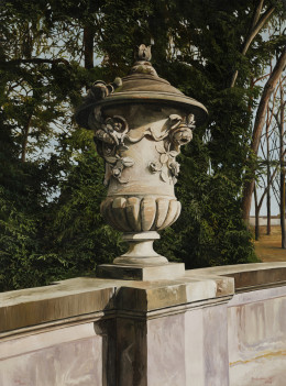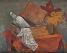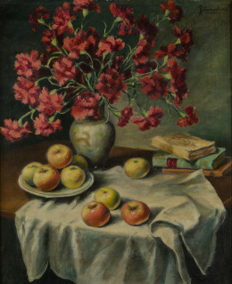 "Bodegón con jarrón de claveles rojos, manzanas y libros".