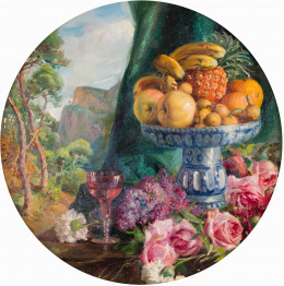 "Bodegón de frutas y flores en paisaje" y "Bodegón con frutas, flores y cerámica", 1925