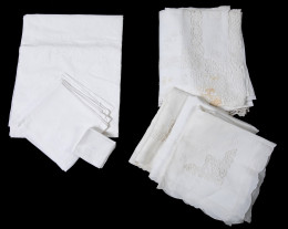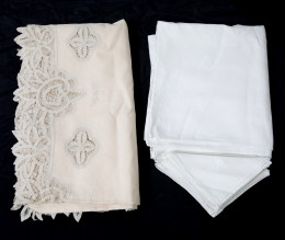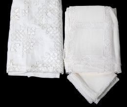 Mantel de hilo blanco con encaje de su color 9 servilletas. 279 x 183